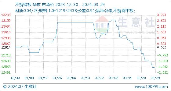 3月29日,生意社不锈钢板基准价为12560.00元/吨,与本月初(13150.00元/吨)相比,下降了-4.49%。