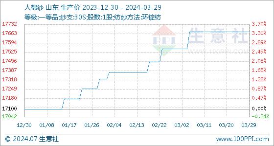 3月29日,生意社人棉纱基准价为17675.00元/吨,与本月初(17550.00元/吨)相比,上涨了0.71%。