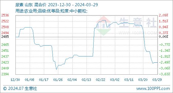 3月29日,生意社尿素基准价为2423.33元/吨,与本月初(2516.67元/吨)相比,下降了-3.71%。