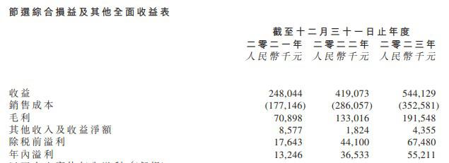 截至二零二一年、二零二二年及二零二三年十二月三十一日止年度,公司的收益分别约为人民币2.48亿元、人民币4.19亿元及人民币5.44亿元。同期年内溢利分别约为人民币1324.6万元、人民币3653.3万元及人民币5521.1万元。