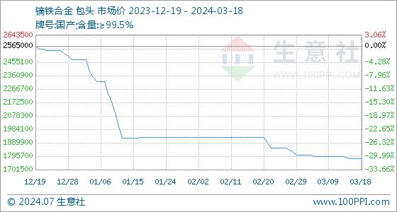 3月18日,生意社镝铁合金基准价为1780000.00元/吨,与本月初(1805000.00元/吨)相比,下降了-1.39%。