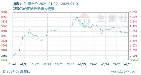 4月1日,生意社沥青基准价为3576.57元/吨,与上月初(3606.57元/吨)相比,下降了-0.83%。