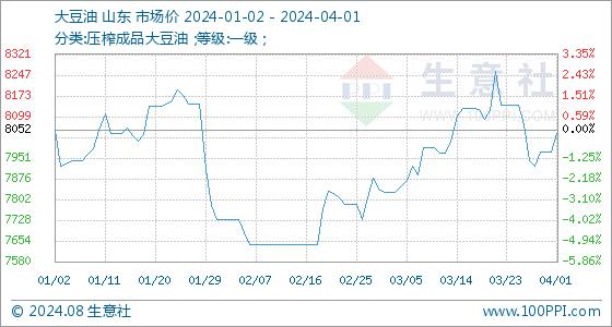 4月1日,生意社大豆油基准价为7972.00元/吨,与上月初(7840.00元/吨)相比,上涨了1.68%。