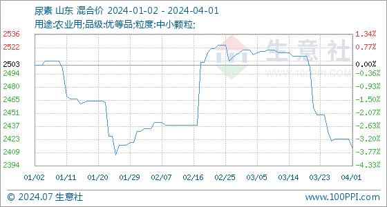 4月1日,生意社尿素基准价为2423.33元/吨,与上月初(2516.67元/吨)相比,下降了-3.71%。