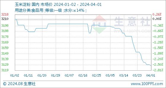 4月1日,生意社玉米淀粉基准价为3130.00元/吨,与上月初(3198.00元/吨)相比,下降了-2.13%。