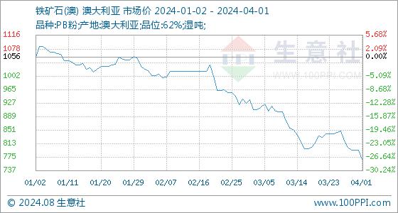4月1日生意社铁矿石(澳)基准价为793.44元/吨