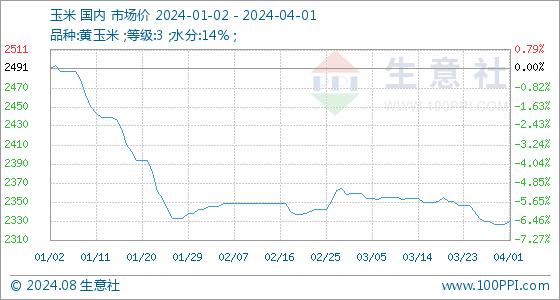 4月1日,生意社玉米基准价为2327.14元/吨,与上月初(2358.57元/吨)相比,下降了-1.33%。