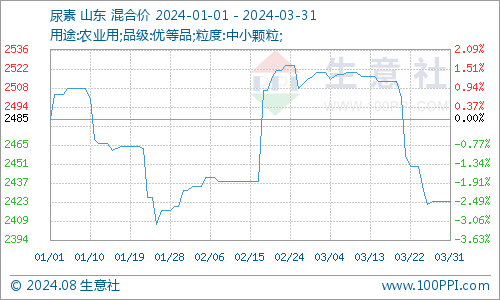 3月国内尿素价格弱势走低,对对氯化铵支撑走弱。据生意社商品行情分析系统显示截至3月28日国内尿素价格在2423元/吨,较3月初的2520元/吨下跌3.84%。当前尿素市场供需错配,尿素日产量仍处高位,但农业基层方面零散补单,经销商随用随采,尿素价格弱势走低。