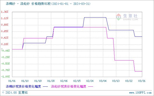 据生意社商品行情分析系统显示,2月国内纯涤纱和涤棉纱市场价格小幅小跌,交易总体偏淡。截至3月31日,山东地区纯涤纱市场均价在12325元/吨;涤棉纱市场均价在17300元/吨。