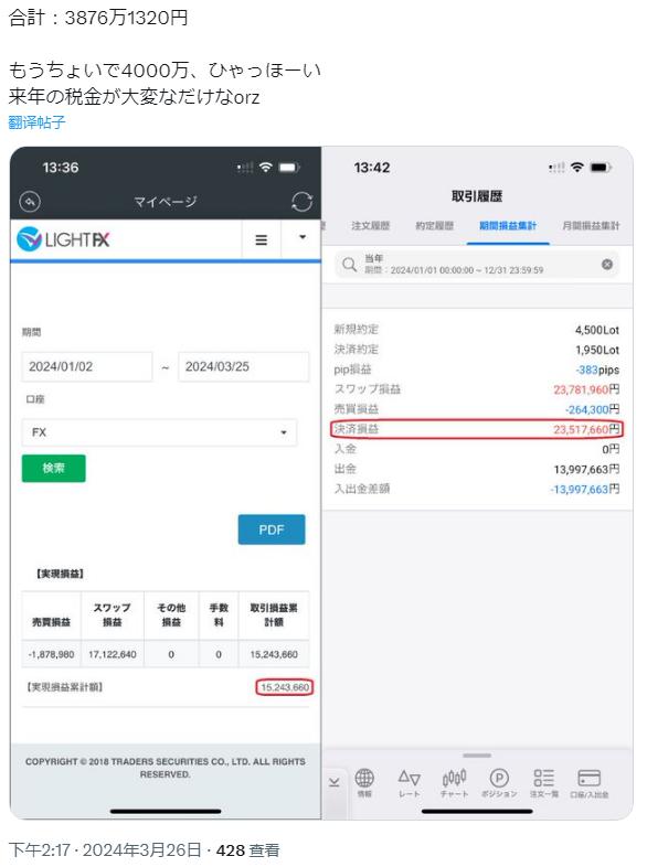 3月26日,高桥在X平台上晒出了自己在不同外汇交易平台上的收益截图:截至3月25日,今年以来,高桥所有持仓的外汇已套利合计超过3800万日元。