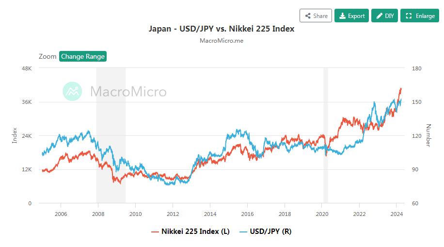 顺着日元贬值的逻辑,连锁反应的另一端是日本股市。