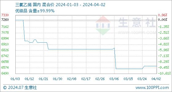 4月2日,生意社三氯乙烯基准价为6600.00元/吨,与本月初持平。