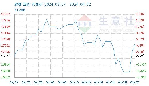 上周棉价在触及年后新低后,受外围利好刺激,国内现期货行情均小幅上涨。据生意社商品行情分析系统,4月2日3128B级皮棉现货价格在17066元/吨,较2月中旬上涨0.53%。