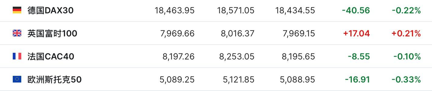 2.截至发稿,德国DAX指数跌0.22%,英国富时100指数涨0.21%,法国CAC40指数跌0.10%,欧洲斯托克50指数跌0.33%。