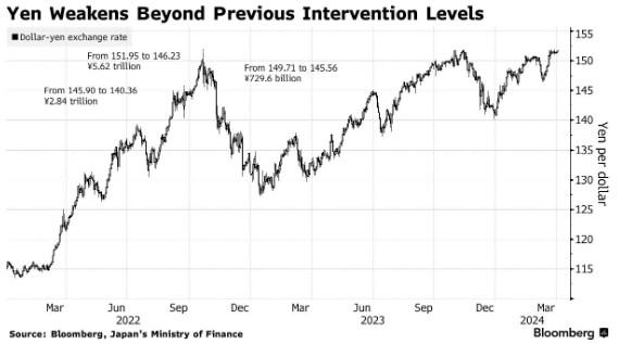 他的观点与其他策略师不谋而合,多名策略师预计日本央行任何干预措施都仅会给日元带来短暂支撑。日元疲软程度已超过2022年促使日本当局入场干预的水平,目前日本官员已加强对投机性举动的警告。