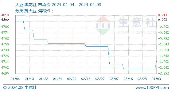 4月3日,生意社大豆基准价为4700.00元/吨,与本月初持平。