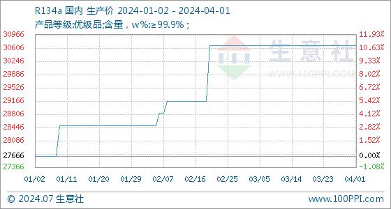 三代制冷剂配额政策落地,制冷剂行业格局持续优化,制冷剂行业整体进入景气周期,第一季度制冷剂R134a价格强势上行。4月1日,生意社R134a基准价为30666.67元/吨,目前是年内高位运行,出口需求有待提升,厂家挺价心态维持,现阶段整体维稳。