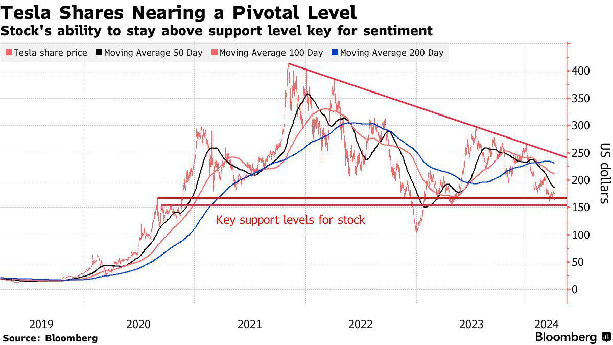 特斯拉(TSLA.US)跌跌不休150美元成关键支撑位