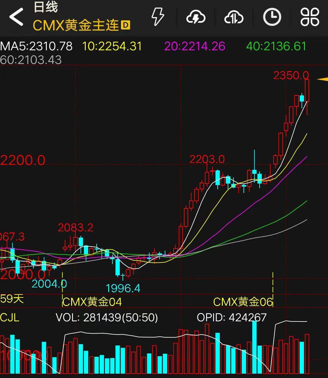 4月5日,COMEX黄金期货主力合约收涨1.6%,报2345.4美元/盎司,盘中再创历史新高2350美元/盎司,周涨幅4.8%。期货日报记者了解到,当前在美国货币政策确定转向的背景下,叠加近期地缘政治冲突频发,驱动国际金价屡创新高。