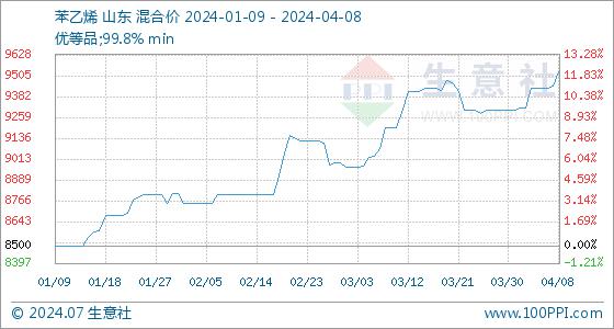 4月8日,生意社苯乙烯基准价为9442.00元/吨,与本月初(9300.00元/吨)相比,上涨了1.53%。