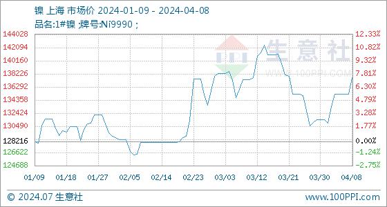 4月8日,生意社镍基准价为135200.00元/吨,与本月初(131466.67元/吨)相比,上涨了2.84%。