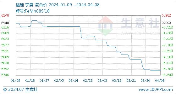 4月8日,生意社锰硅基准价为5785.00元/吨,与本月初(5788.33元/吨)相比,下降了-0.06%。