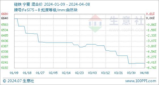 4月8日,生意社硅铁基准价为6235.71元/吨,与本月初(6232.86元/吨)相比,上涨了0.05%。
