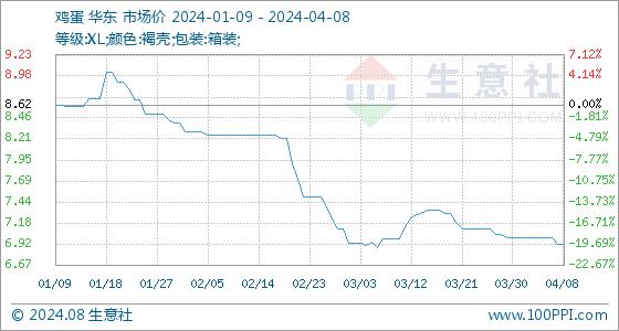 4月8日,生意社鸡蛋基准价为6.92元/公斤,与本月初(7.00元/公斤)相比,下降了-1.14%。