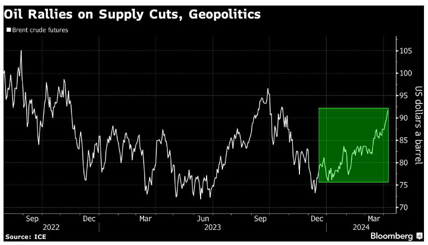 与此同时,欧洲原油市场受到胡塞武装在红海发动袭击的压力走高,数百万桶原油绕道非洲,导致一些供应推迟了数周。北海一条重要石油管道的中断、利比亚的动荡和南苏丹的一条管道受损也推动了油价上涨,而美国的制裁使俄罗斯无法使用此前向包括印度在内的买家运送石油的油轮。