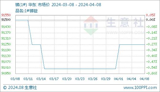 2024年4月1日至4月8日华东地区锑锭市场小幅上调,本周价格在91250元/吨,涨0.27%。