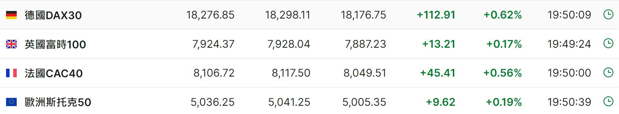 2. 截至发稿,德国DAX指数涨0.62%,英国富时100指数涨0.17%,法国CAC40指数涨0.56%,欧洲斯托克50指数涨0.19%。