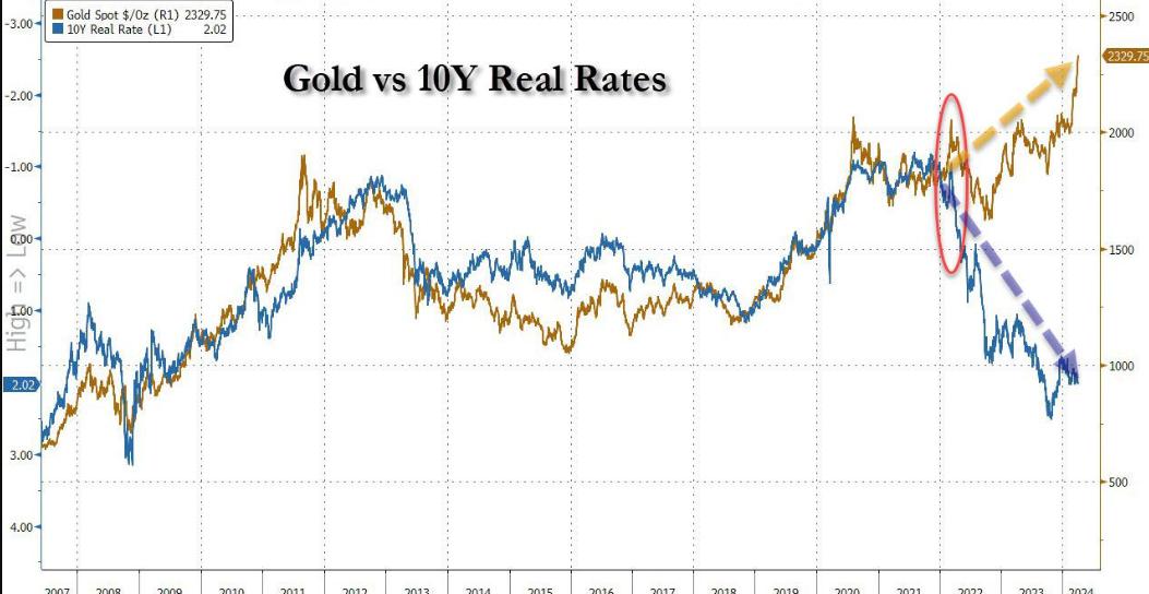根据历史经验和传统的分析框架,黄金作为抗通胀和避险品种,美元走强,通胀降温,降息延迟,似乎一切的信息都对黄金不是好消息,然而黄金价格走势却依然我行我素一路向北,已经完全无法用历史经验来解释这个现象。