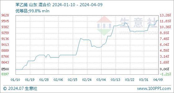4月9日,生意社苯乙烯基准价为9526.00元/吨,与本月初(9300.00元/吨)相比,上涨了2.43%。