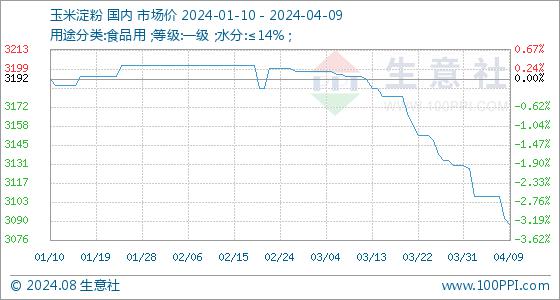 4月9日,生意社玉米淀粉基准价为3092.00元/吨,与本月初(3130.00元/吨)相比,下降了-1.21%。