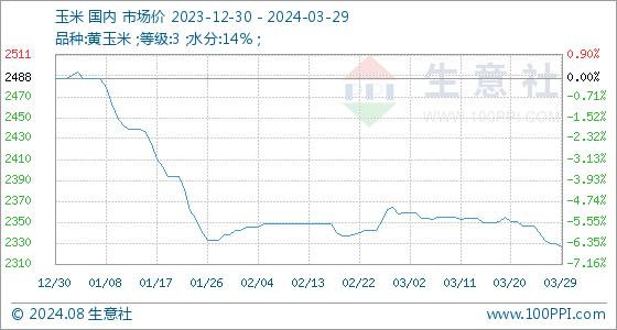 3月29日,生意社玉米基准价为2330.00元/吨,与本月初(2358.57元/吨)相比,下降了-1.21%。