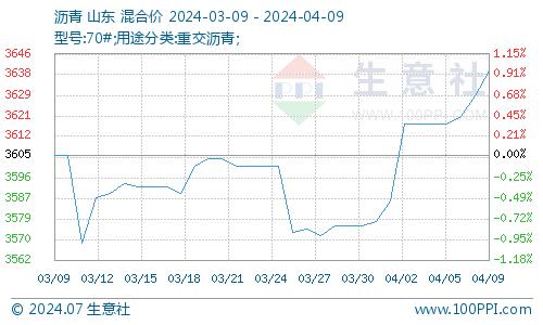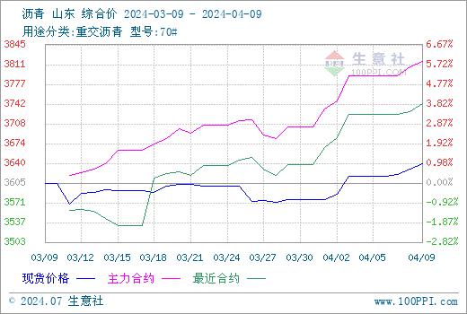 据生意社商品行情分析系统,4月1日至9日,山东地区沥青价格自3578元/吨上涨至3639元/吨,涨幅1.72%,环比上涨0.95%,同比下跌4.78%。市场呈现北强南弱局面,北方多地价格上行,主要是国际原油偏强运行,带动成本增加,温度回升需求量有所提升,业者惜售挺价推涨;南方地区价格相对偏弱,主要生产企业报价下调带动市场价格下行。