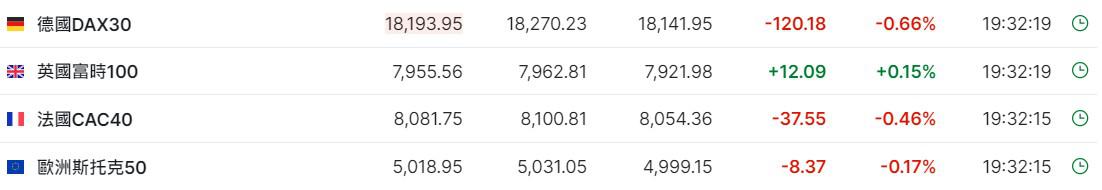 2.截至发稿,德国DAX指数跌0.66%,英国富时100指数涨0.15%,法国CAC40指数跌0.46%,欧洲斯托克50指数跌0.17%。