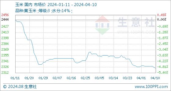 4月10日,生意社玉米基准价为2325.71元/吨,与本月初(2327.14元/吨)相比,下降了-0.06%。