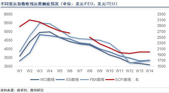 从运价触底节奏去看,SCFI欧线运价已连续四周反弹,其次是FBX欧线和XSI欧线运费于节前反弹;WCI欧线运费稍显滞后仍下跌,但跌幅明显放缓,后续反弹概率大。