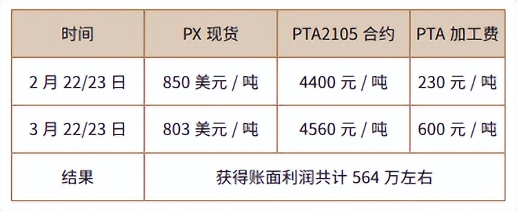例如 2021 年 2 月 22 日、23 日,逐步买入 PTA 期货 2105 合 约 3053 手,同时卖出对应量的 PTA 生产原料 PX 1 万吨,3 月 22、 23 日加工费修复后将 PTA2105 合约逐步平仓,同时买入 PX 现货 1 万吨结束整个加工费扩大套保(利)过程。
