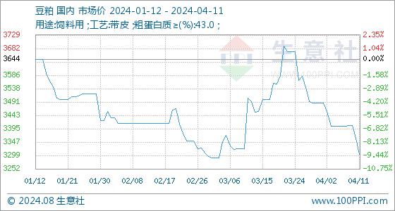 4月11日,生意社豆粕基准价为3362.00元/吨,与本月初(3486.00元/吨)相比,下降了-3.56%。