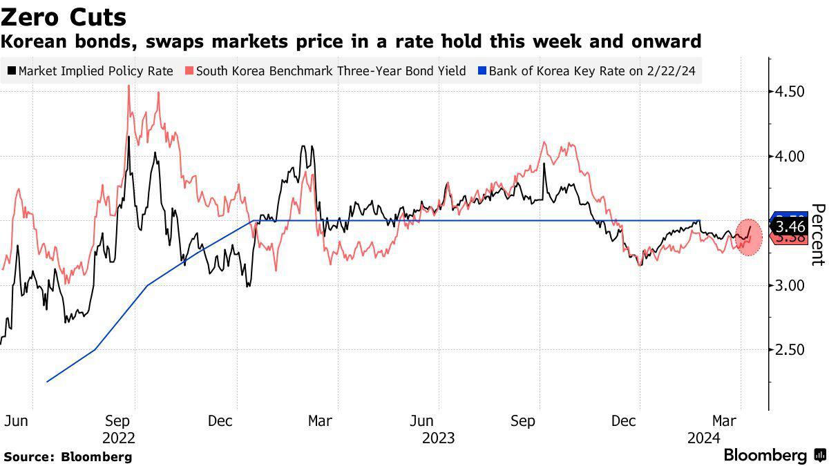 其次是货币问题。在强劲的美国经济数据给美联储降息前景蒙上阴影之后,韩元兑美元汇率今年以来已下跌了超5%。随着市场对美联储今年将降息三次的预期减弱,韩国央行将很难放松其立场,因为降息将导致韩元兑美元进一步走弱。而稳定的汇率对韩国至关重要,因为韩国的食品和能源严重依赖进口。韩元的迅速贬值可能还会引发资本外流、扰乱金融市场,这是韩国央行不惜一切代价希望避免的结果。