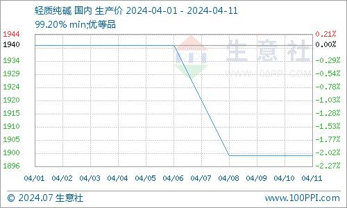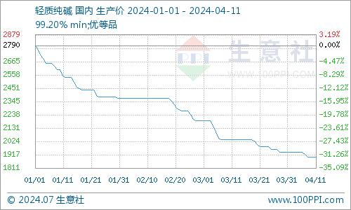 据生意社商品分析系统显示,4月上旬纯碱价格弱势运行。月初市场均价为1940元/吨,4月11日市场均价为1900元/吨,价格下跌2.06%,较去年同期下跌30.15%。纯碱自2024年年初价格一直呈现弱势运行行情,年初至今已下跌31.9%。