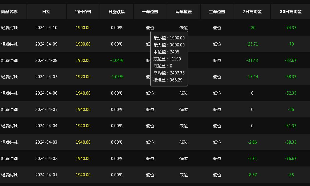 纯碱处于一年低位、两年低位、三年地位,商品分析系统显示,纯碱近1年平均值为2407.78元/吨,中位值为2495元/吨,最小值为1900元/吨,最大值为3090元/吨,低位差(较近1年历史最低位的价差)0元/吨,顶位差(较近1年历史最高位价差)-1190元/吨。