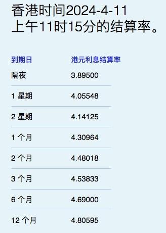 4月11日,港元拆息持续走低,与楼按相关的一个月拆息连跌9日,今报4.30964%,创七个月新低。反映银行资金成本的三个月拆息进一步降至4.53833%,见逾七个月低位。长息方面,六个月及一年期分别跌至4.69%和4.80595%。不过,隔夜息微升至3.895%,为近一周新高。