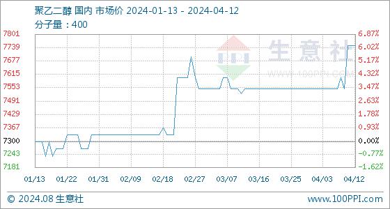 4月12日,生意社聚乙二醇基准价为7750.00元/吨,与本月初(7550.00元/吨)相比,上涨了2.65%。