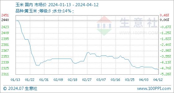 4月12日,生意社玉米基准价为2324.29元/吨,与本月初(2327.14元/吨)相比,下降了-0.12%。
