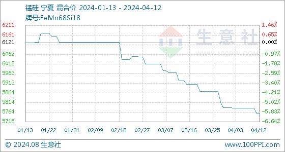 4月12日,生意社锰硅基准价为5756.67元/吨,与本月初(5788.33元/吨)相比,下降了-0.55%。