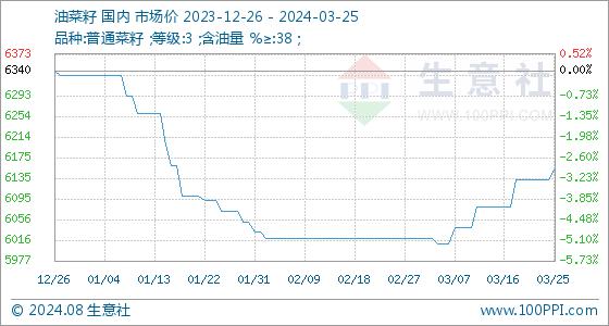 3月25日生意社油菜籽基准价为6132.00元/吨