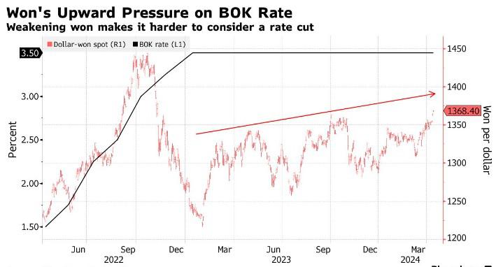 彭博经济学家Hyosung Kwon称:“美联储政策路径的不确定性越来越大,这让韩国央行有了另一个理由,暂时将政策利率维持在限制区间。随着市场对美联储降息时机的预期减弱,韩元的下行压力加大。”